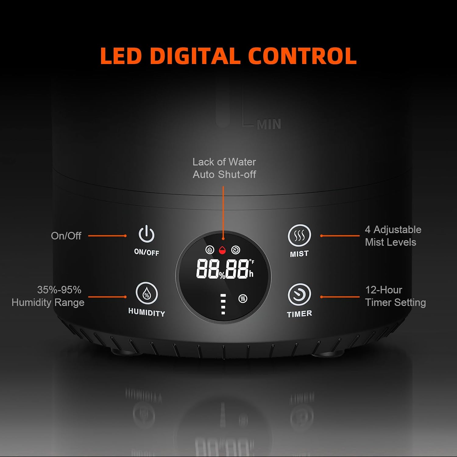 Verstellbare Feuchtigkeitsregelung und kühler Nebel: Dieser Luftbefeuchter verfügt über 1-4 Stufen der Nebelvolumenanpassung (von niedrig bis hoch) und kann die Luftfeuchtigkeit auf 35%-95% einstellen. Das eingebaute Hygrometer kann die Luftfeuchtigkeit effektiv anzeigen und dazu beitragen, dass sie auf dem idealen Niveau bleibt.