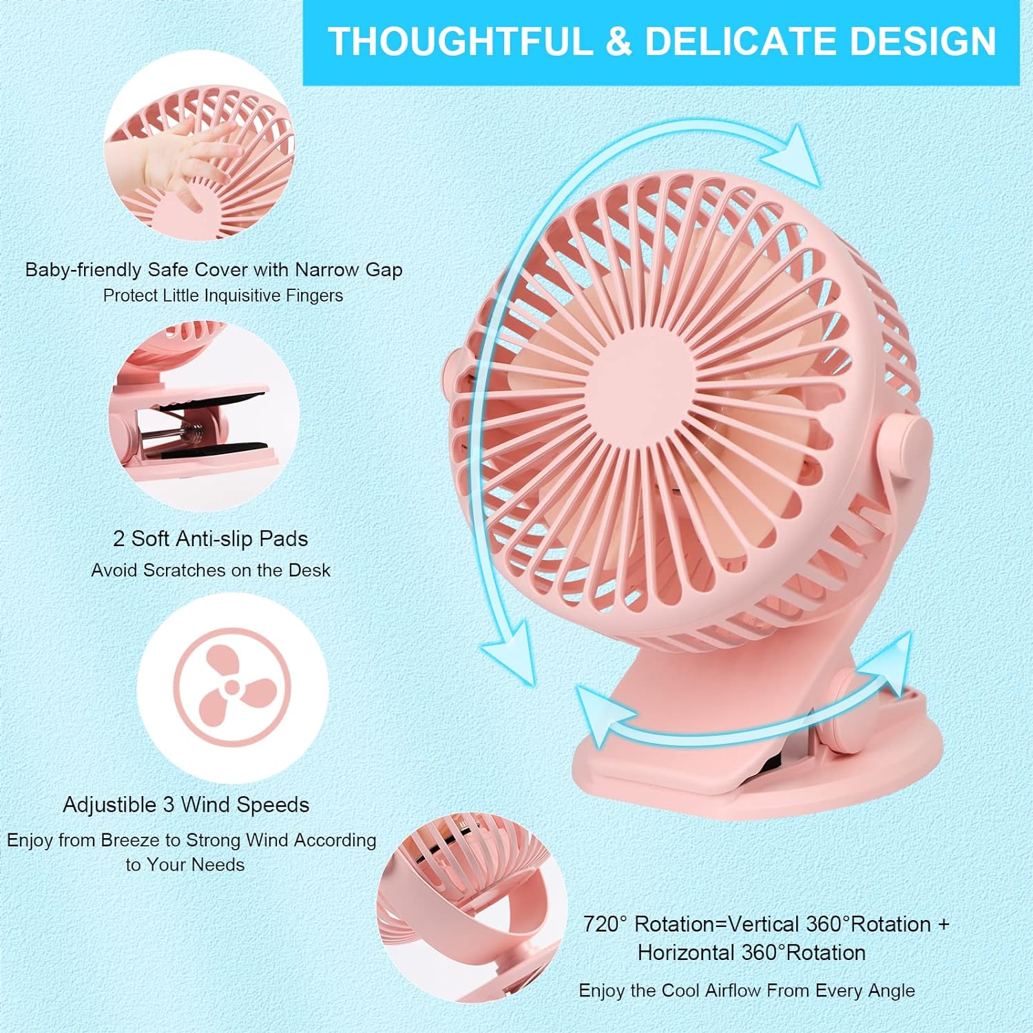 Mehrzweck-Clip-On- und Schreibtisch-Lüfter: Unser Clip-On-Lüfter kann an einer Dicke von weniger als 5 cm (1,97 Zoll) befestigt werden, um die Position zu fixieren (z. B. an einem Kinderwagen und einem Kinderbett); oder kann leicht auf allen glatten Flächen platziert werden. Die weichen Anti-Rutsch-Pads am Clip können Kratzer für die Oberfläche verhindern. Geprüfter stabiler Clip kann den Lüfter sicher halten.