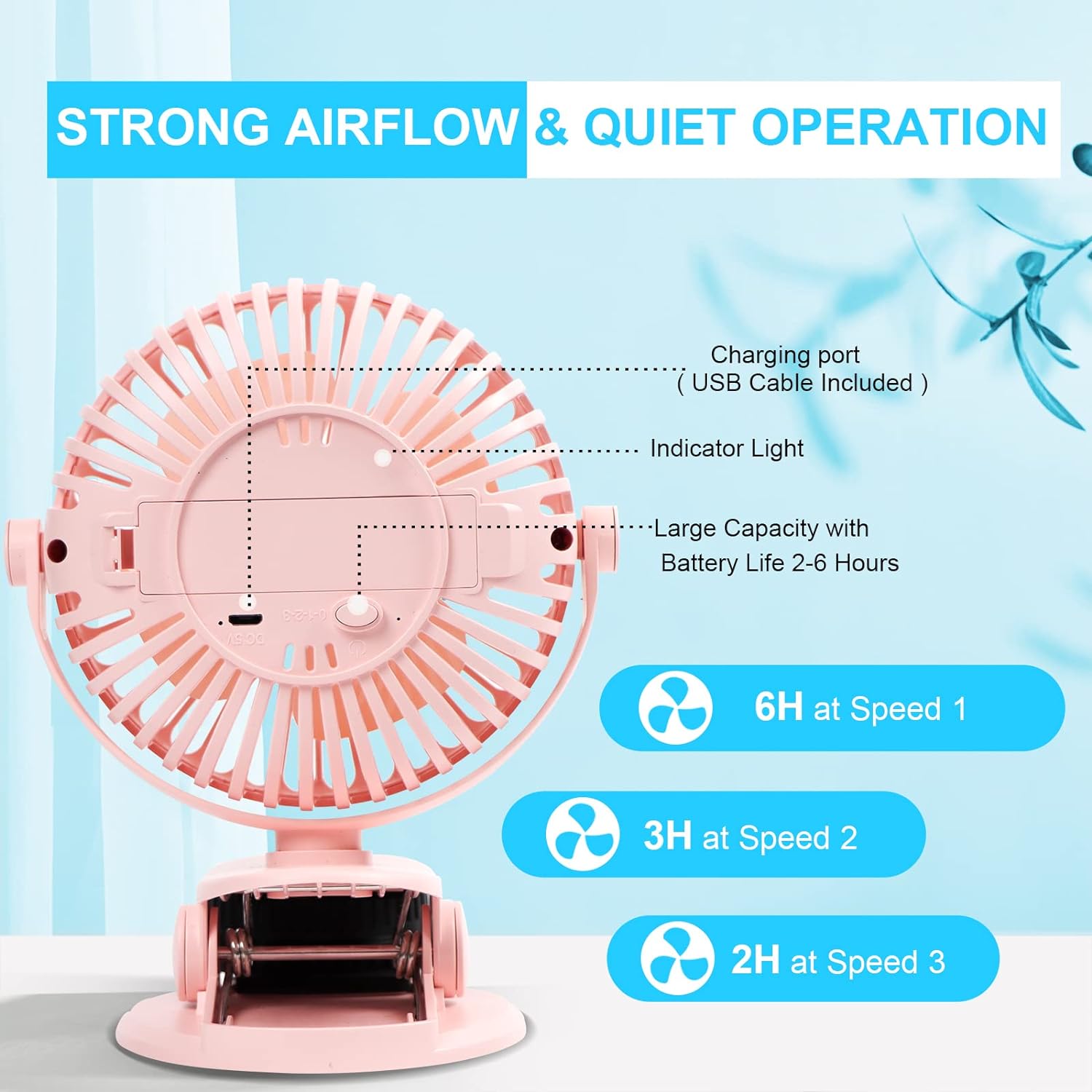 Starker Wind & Ultra Leise: Der wiederaufladbare Clip-On-Lüfter ist mit einem bürstenlosen Motor mit stärkerem Wind, aber geringerem Geräusch ausgestattet. Machen Sie sich also keine Sorgen, dass Sie beim Arbeiten, Lernen oder Schlafen gestört werden.