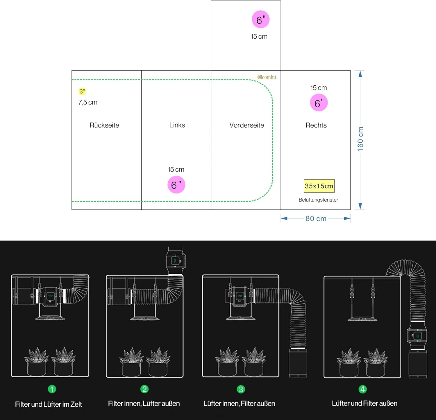 Flexible Belüftungsoptionen: Ausgestattet mit 3x 6″/150mm und einem 3″/75mm Lüftungsanschluss, bietet unsere Grow Box hervorragende Belüftungsoptionen für Ihre Pflanzen.