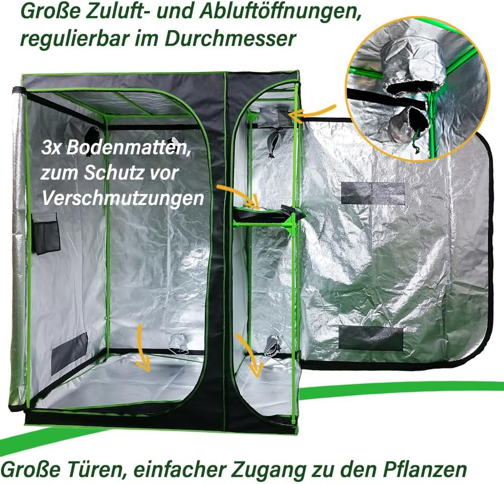 BESONDERHEITEN: Das Gewächshaus besitzt separate Zugänge mit Doppel-Zugbändern, welche die Installation von Belüftungssystemen, Kabeln und Zubehör ermöglichen. Das Innenraumklima kann über die Klett-Zuluftklappen geregelt werden. Um unerwünschte Schädlinge draußen zu halten, besitzt das Zelt ein Netz als Einsatz.