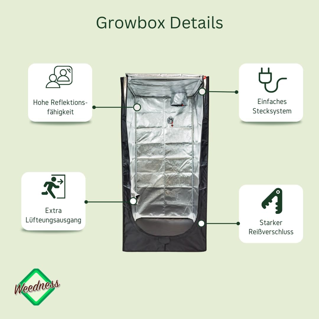 Abmessungen: Das Growzelt hat eine Größe von ca. 150 x 150 x 220 cm.