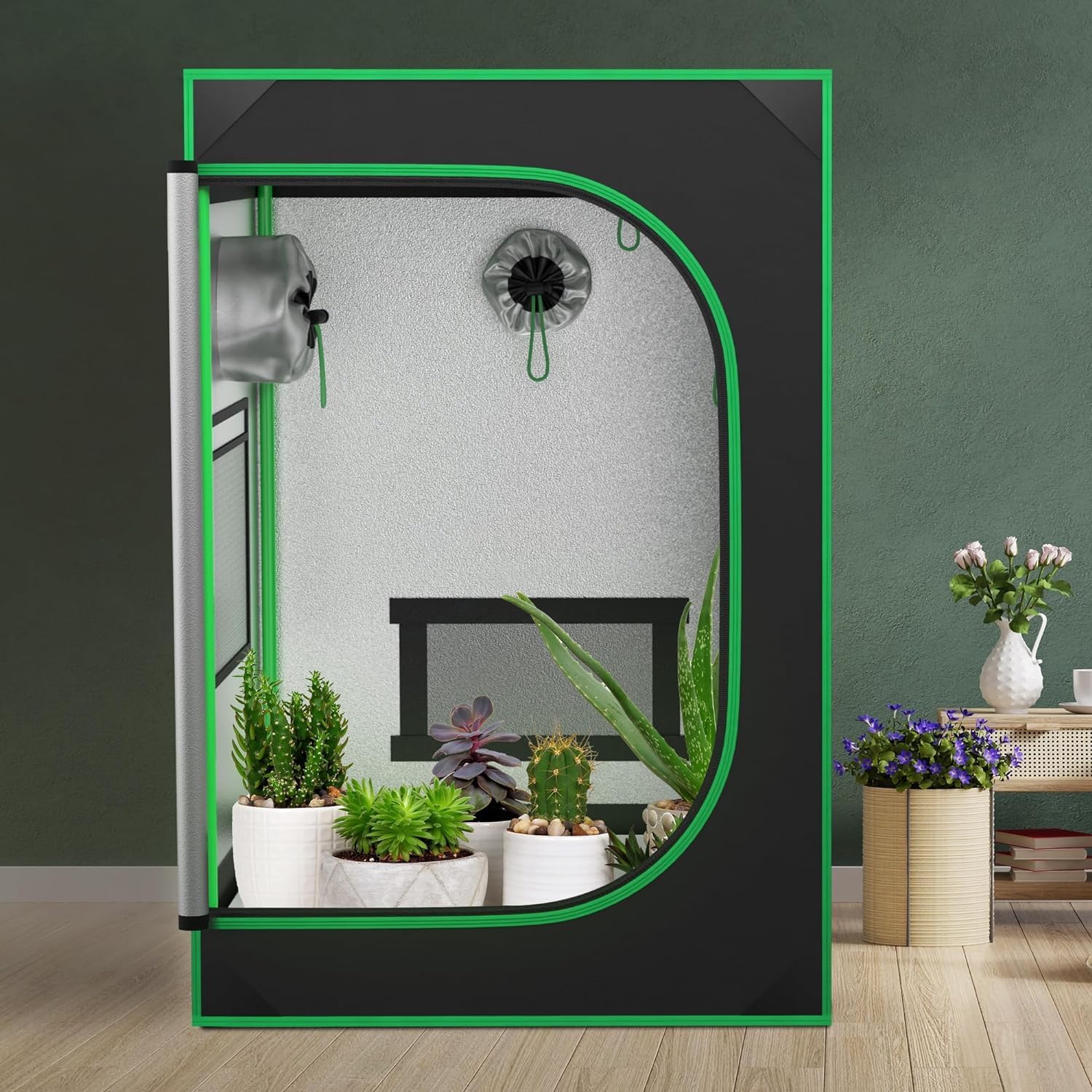 SCHÖN UND PRAKTISCH: Das Zelt wurde mit Blick auf die Belüftungsbedürfnisse Ihrer Pflanzen entwickelt und ist mit verstellbaren Belüftungsöffnungen ausgestattet, die dabei helfen, die Luftfeuchtigkeit im Inneren zu kontrollieren und gleichzeitig die Luftzirkulation zu gewährleisten, damit Ihre Pflanzen frische Luft bekommen. Das Growzelt für Zimmerpflanzen verfügt über leicht zu reinigende Oberflächenmaterialien und einen abnehmbaren Pflanzenständer, der es Ihnen leicht macht, das Innere des Zeltes sauber und ordentlich zu halten.