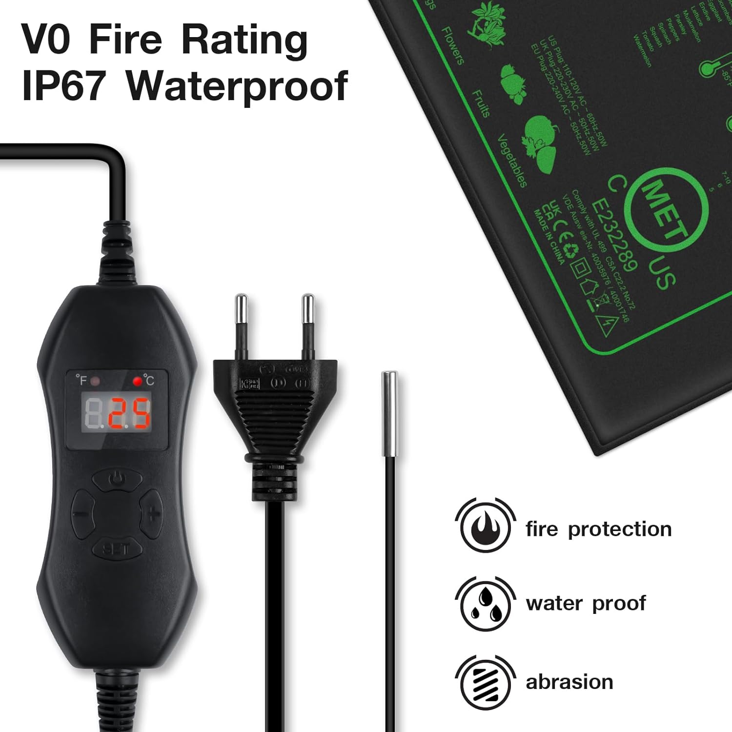 Die Heizmatte ist mit IP67 Wasserschutz und V0 Brandschutz ausgestattet, um maximale Sicherheit zu gewährleisten.