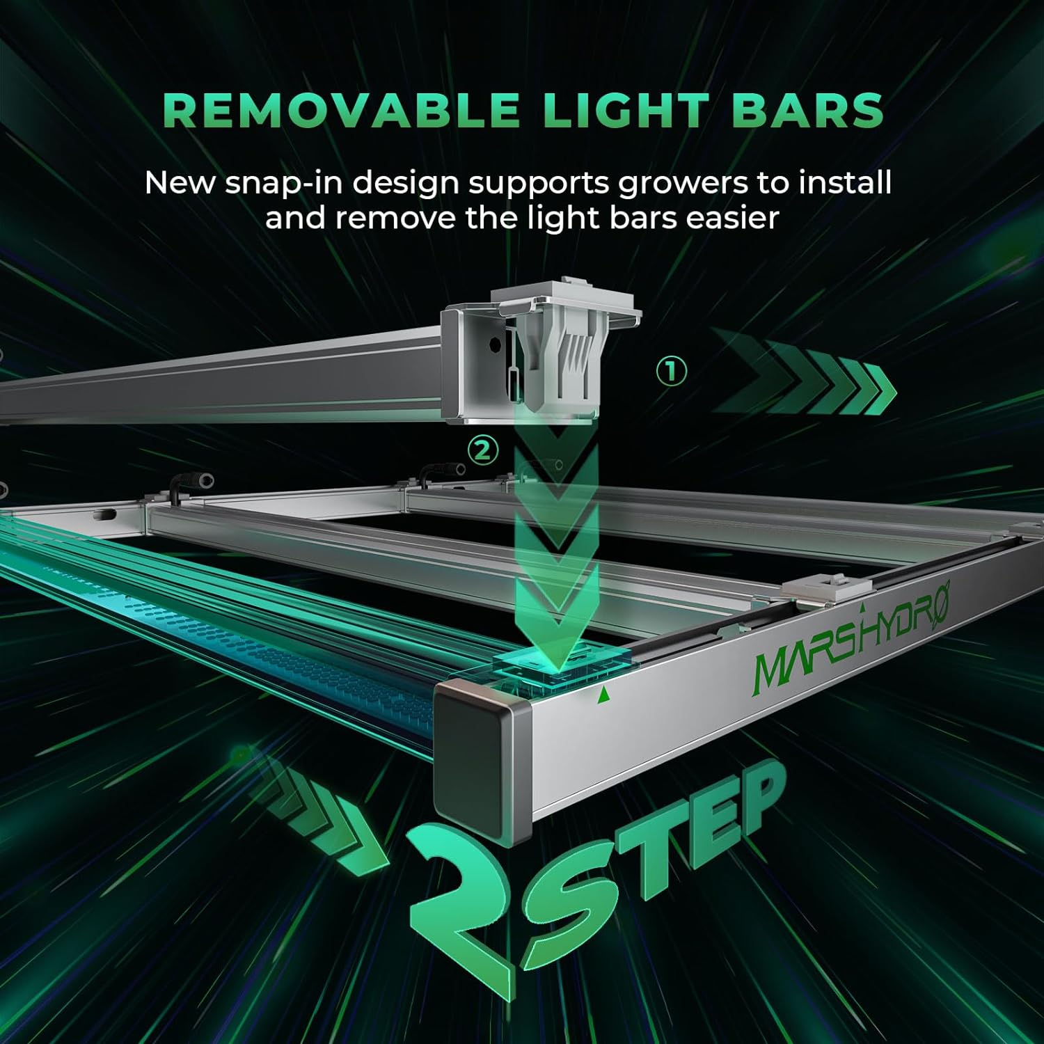 FERNBEDIENUNG UND OTA-DATENÜBERTRAGUNG:Eingebaute abnehmbare Balkenintervalle und Dimmbarkeit ermöglichen die exakte dynamische PPFD-Kontrolle über jede Phase des Pflanzenwachstums, mobiler Zugriff auf die LED-Wachstumslampen über die Mars Hydro APP . Einfache Steuerung der Grow-Lampen und Planung Ihrer Grow-Pläne über Ihr Mobiltelefon