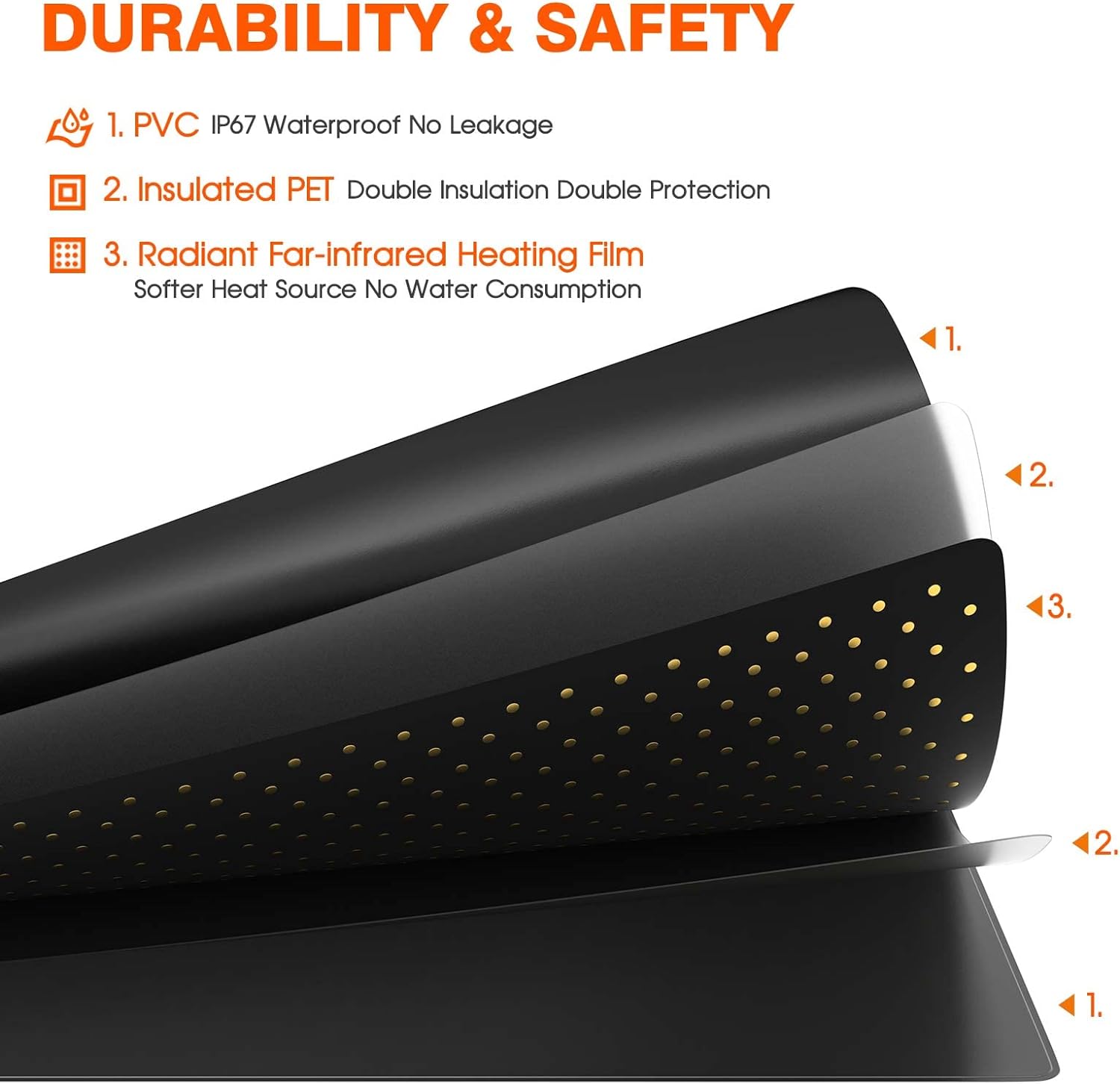 【Neueste Heizfolien-Technologie】 Die 121,9 x 50,7 cm Heizmatte hat das fortschrittlichste Design, erhitzt den Wurzelbereich schnell um 10–25 °C über der Umgebungstemperatur innerhalb von 2 Minuten. Verglichen mit dem traditionellen Heizdraht ist die innovative Ferninfrarot-Filmheizgeschwindigkeit schneller, der Energieverbrauch ist niedriger, die weiche Wärmeverteilung ist gleichmäßiger und verbraucht nicht die Feuchtigkeit in der Luft, was viel förderlich für die Keimung und Wurzelbildung von Indoor-Gartenarbeit ist.