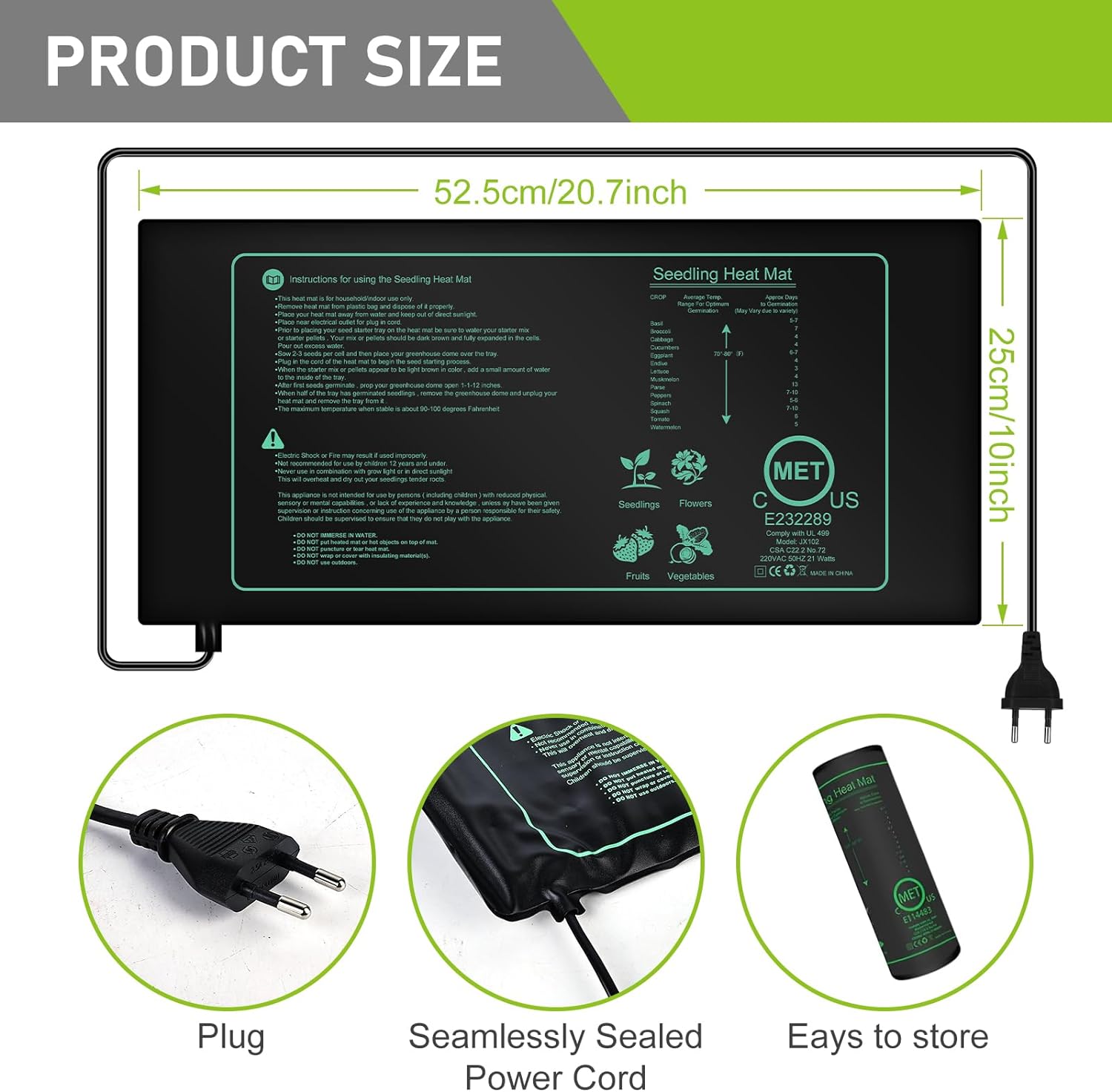 🌱【PACKUNGSINHALT】Wir enthalten 1 Stück Heizmatte Pflanzen mit einer Größe von 25 cm x 52,5 cm/10 x 20,75 Zoll, einer Leistung von 21 W und einer Eingangsspannung von 220 V.