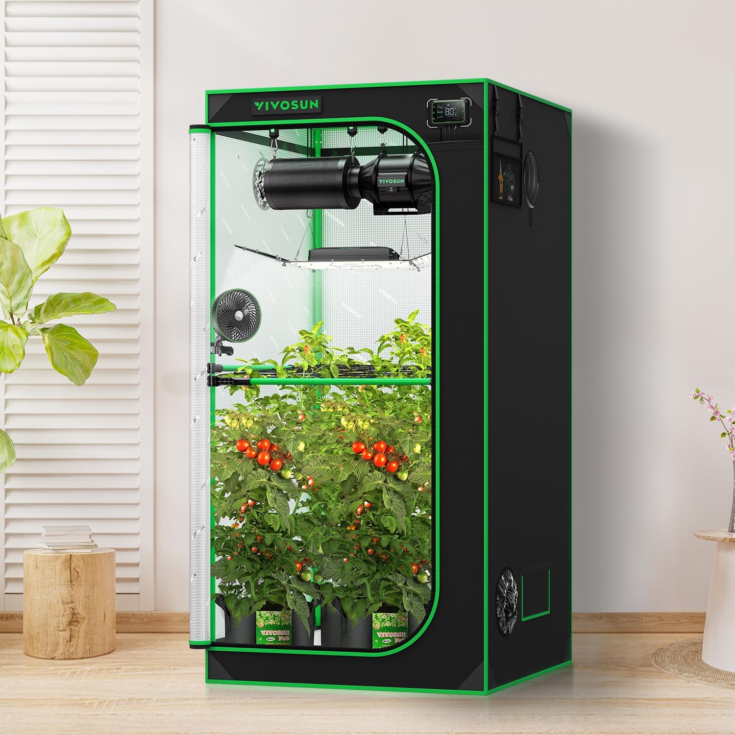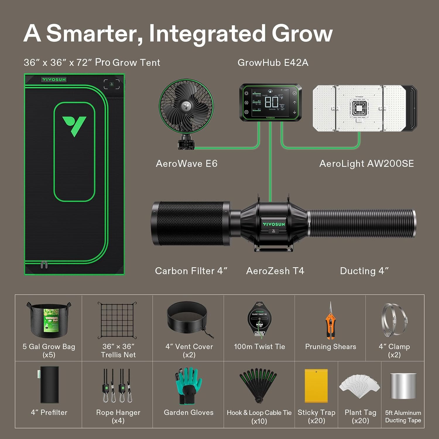 Das intelligente Wachstumszelt-Set von Vivosun stattet dich mit allen wichtigen Werkzeugen aus, die du brauchst, um eine automatisierte Wachstumsumgebung einzurichten und deine Pflanzen vom Samen bis zur Ernte gut zu pflegen. Dieses verbesserte Set enthält die neueste Innovationen von Vivosun wie das Pro-Gewächszelt, den GrowHub-Controller, das integrierte AeroLight SE-Lüfterlicht, den AeroZesh-Inline-Kanallüfter, den AeroWave-Clip-On-Lüfter und den Kohlefilter. Darüber hinaus enthält das Paket eine kuratierte Auswahl an Gartengeräten, darunter Wachstumsbeutel, Rankgitter, Gartenschere, Lüftungsabdeckungen und Bindebänder. Mit seinem Fokus auf mühelose Installation und Automatisierung für eine vereinfachte Gartenverwaltung ermöglicht das Smart-Pflanzzeltset von Vivosun eine effiziente, kostengünstige und produktive Gartenarbeit im Innenbereich.