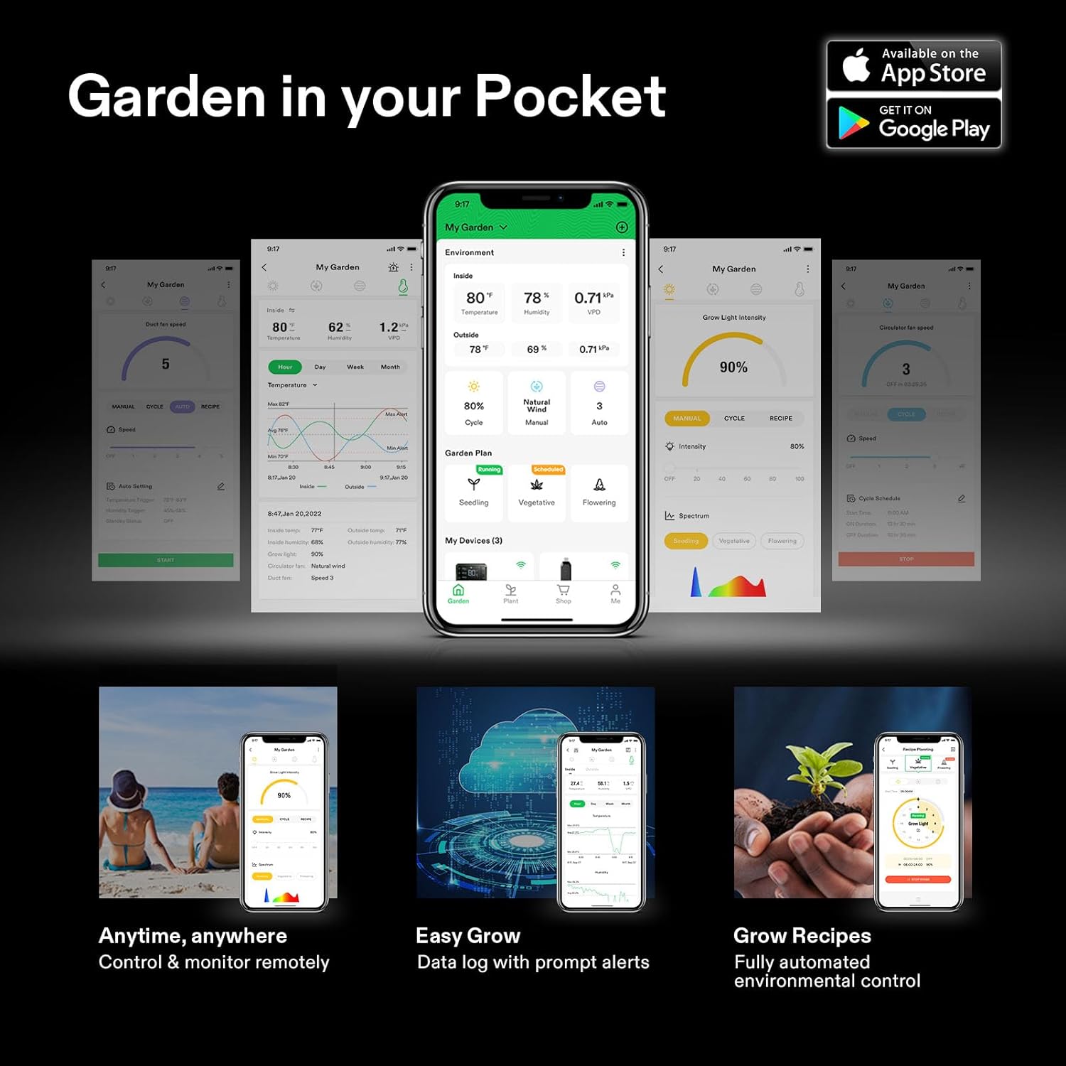 Smart Grow mit GrowHub E42A: Mit einem integrierten Temperatur- und Feuchtigkeitsmesser und einer Sonde überwacht der GrowHub E42A Controller Änderungen sowohl in der internen als auch in der externen Umgebung, einschließlich VPD. Die WLAN-Konnektivität und App-Steuerung ermöglichen es dir, von überall aus auf Echtzeitdaten zuzugreifen und Geräte fernzusteuern.