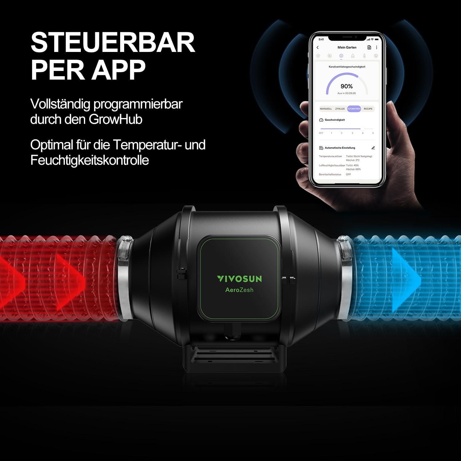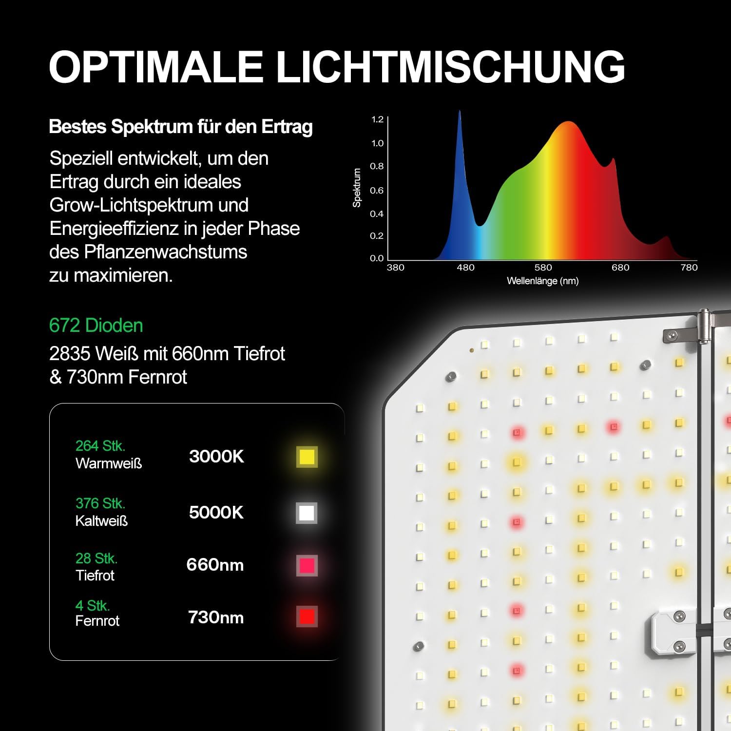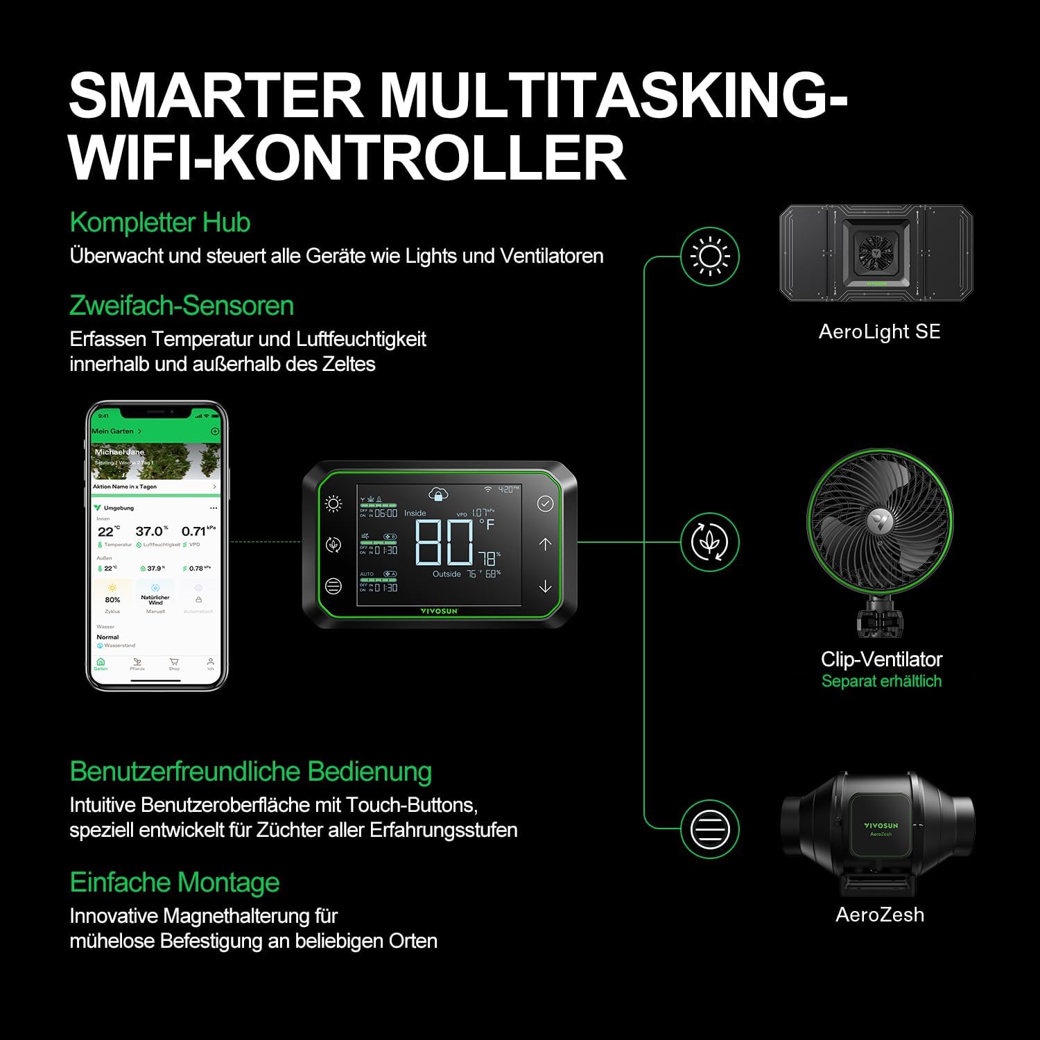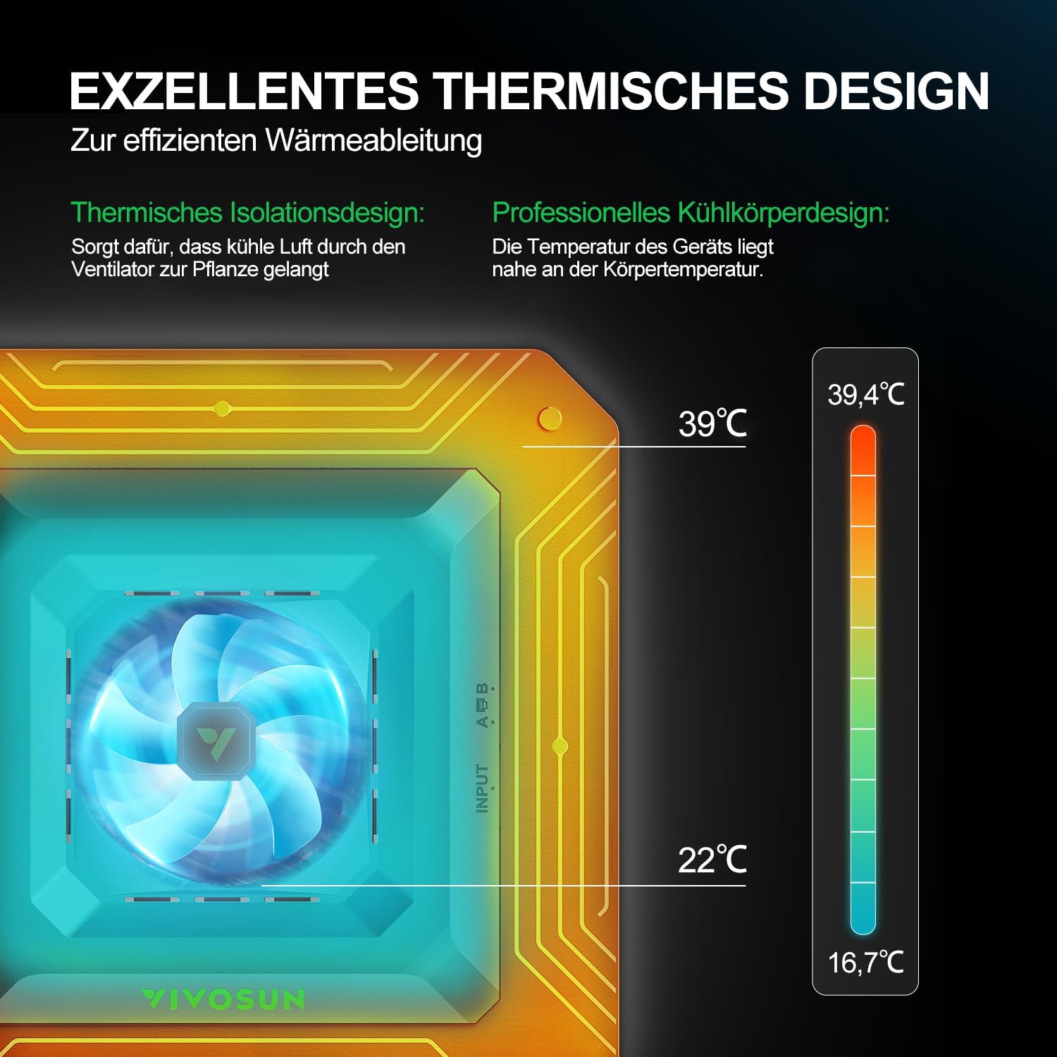 2-in-1-Grow Light mit Zirkulationsventilator: Dies ist das erste Vollspektrum-LED-Grow Light mit einem voll integrierten Zirkulationsventilator. Der programmierbare Ventilator erhöht den Luftstrom erheblich in die Kabinenhaube