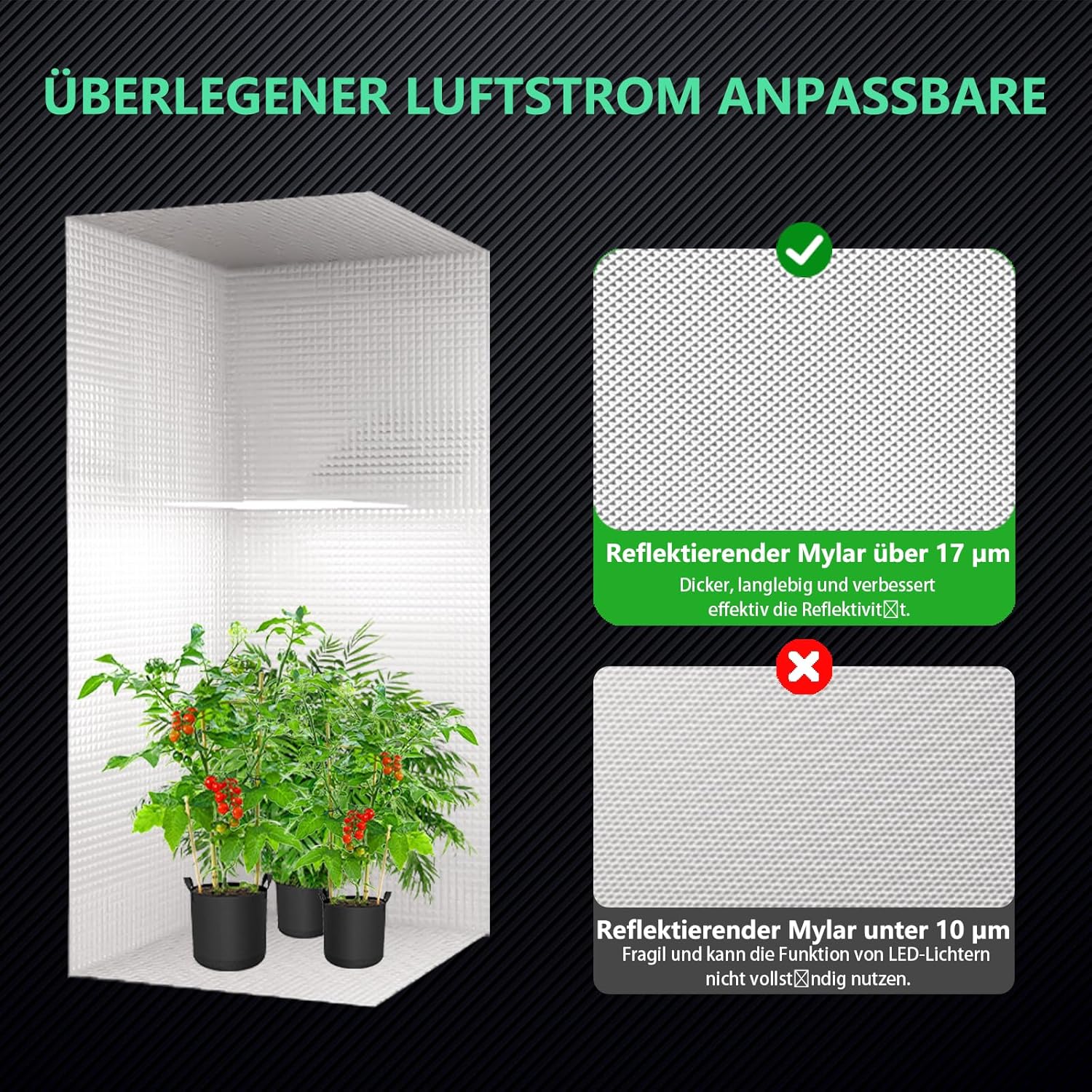 OPTIMALE REFLEKTIONSRATE: Das Growzelt besteht aus hochwertigem 600D-Segeltuch, das umweltfreundlich und ungiftig ist. Es sorgt dafür, dass unerwünschte Gerüche nicht entweichen. Die 100% reflektierenden Mylar-Wände verhindern Lichtverluste und fördern ein effektives Pflanzenwachstum.