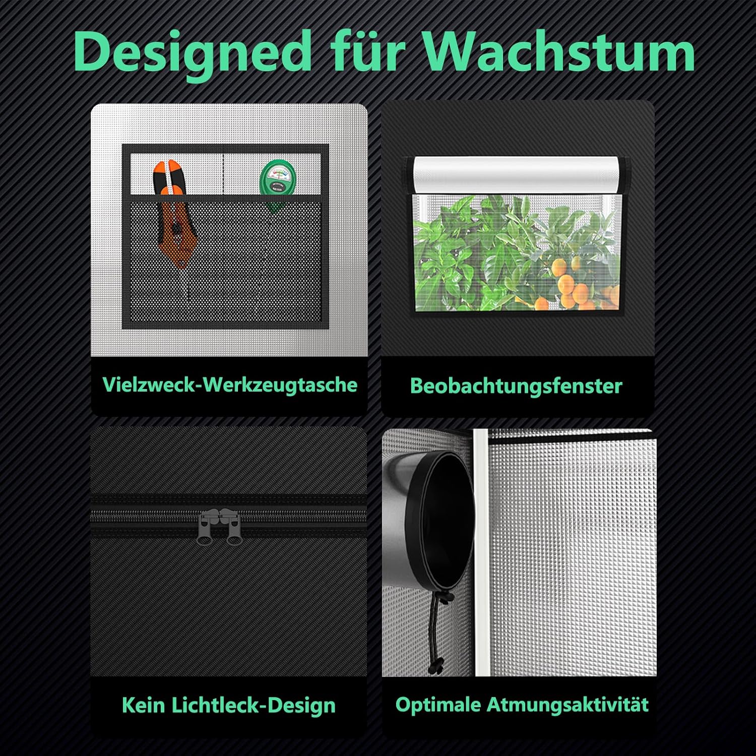 EINFACHER ZUGANG & BELÜFTUNG: Die Grow box verfügt über eine große Tür, die einfachen Zugang und Bewegung der Pflanzen ermöglicht. Ein Beobachtungsfenster erleichtert den Blick ins Innere, während mehrere Lüftungsöffnungen für verschiedene Gebläsefilter sorgen.